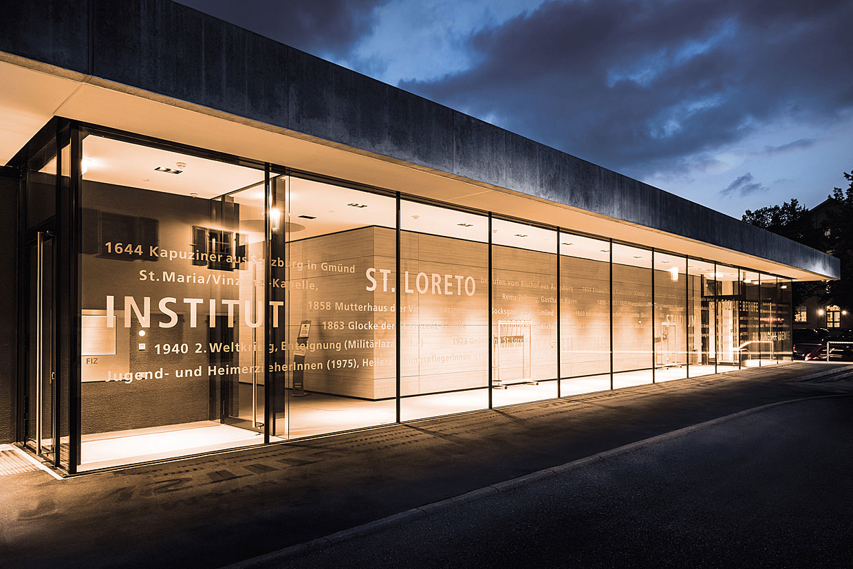 Ein moderner eingeschossiger Anbau, der eine Cafeteria, weitere Klassen sowie eine Kapelle beinhaltet, kennzeichnet nun den neuen Haupteingang ins Gebäude. Der Neubau ist eindeutig ablesbar und kontrastiert gestalterisch bewusst zum Altbau.