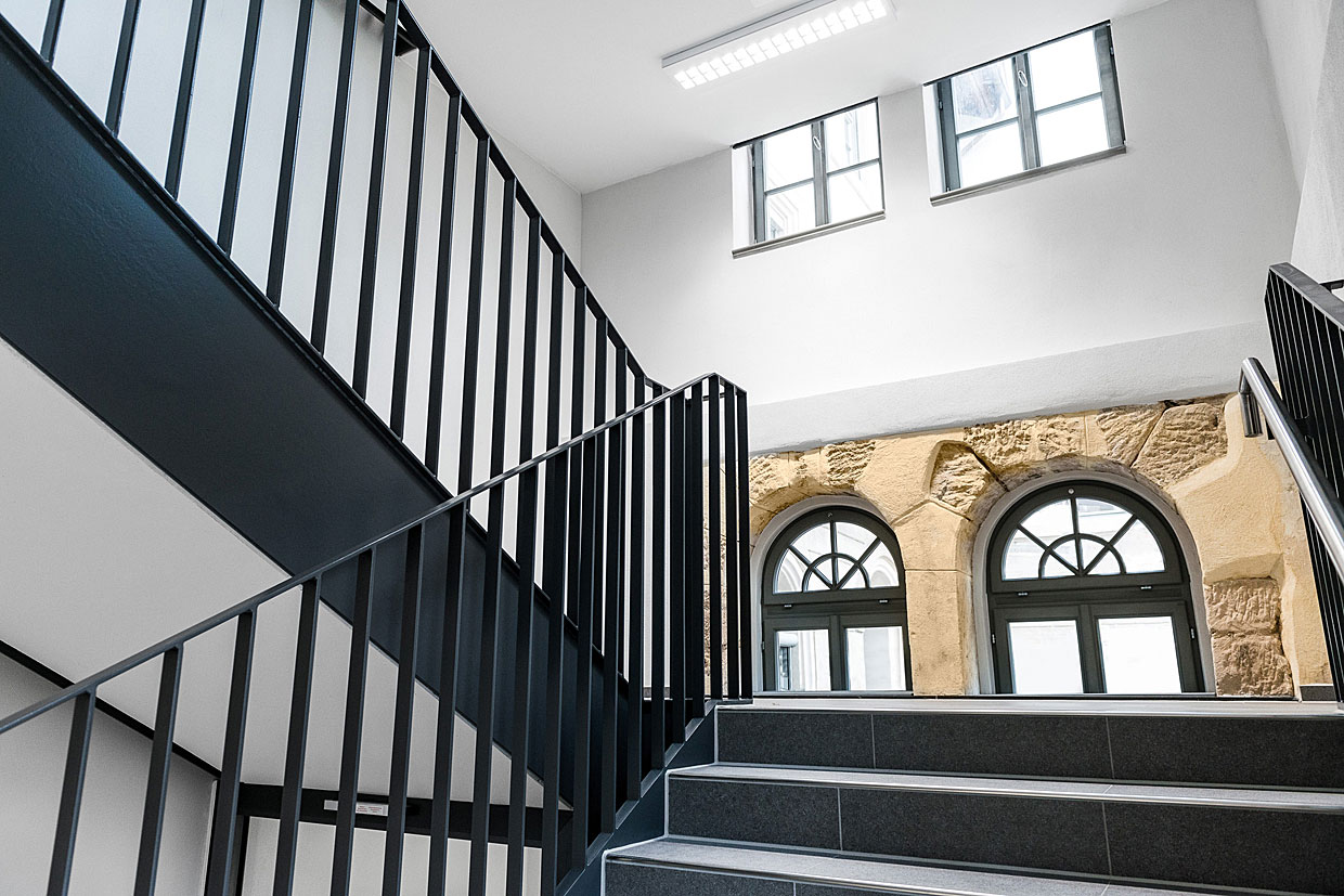 Insgesamt wurden knapp 3.200qm Nutzfläche im Bestand umgebaut und in der Erweiterung nochmal zusätzliche 400qm neu geschaffen.